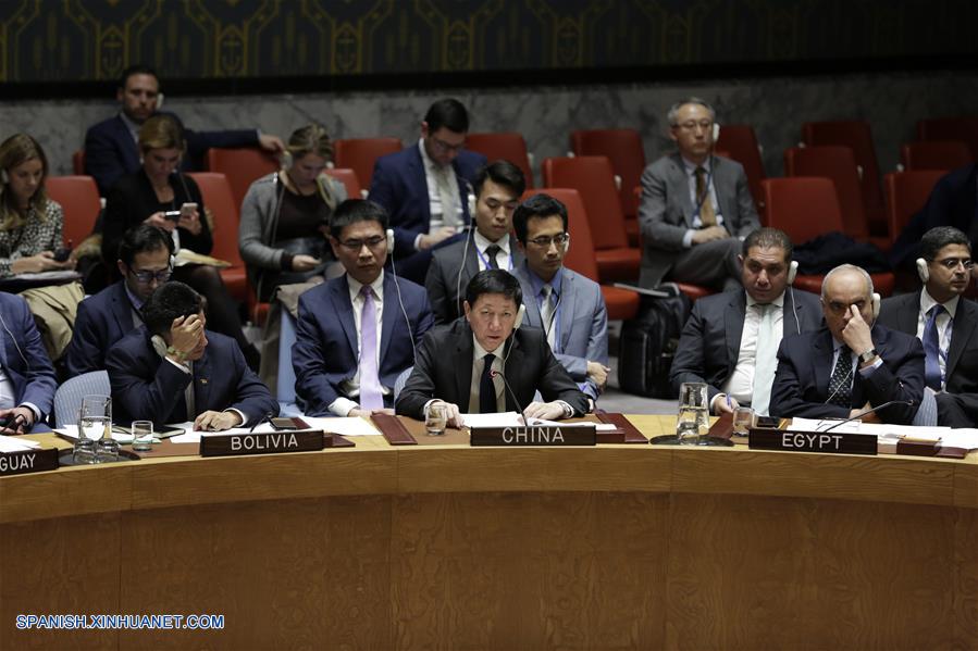 Wu Haitao (c-frente), representante permanente adjunto de China ante la Organización de las Naciones Unidas (ONU), pronuncia un discurso luego de que el Consejo de Seguridad de la ONU no pudiera adoptar una resolución elaborada por Estados Unidos para renovar el mandato del mecanismo que investiga los ataques químicos en Siria, en la sede de la ONU, en Nueva York, Estados Unidos, el 16 de noviembre de 2017. (Xinhua/Li Muzi)