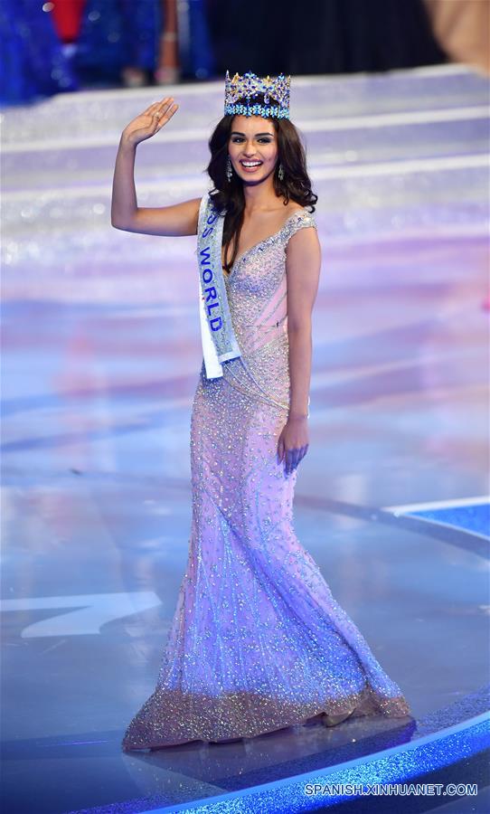 Manushi Chhillar de India, reacciona tras ser coronada durante la final del 67 Concurso de Belleza Miss Mundo, en Sanya, provincia de Hainan, en el sur de China, el 18 de noviembre de 2017. (Xinhua/Guo Cheng)