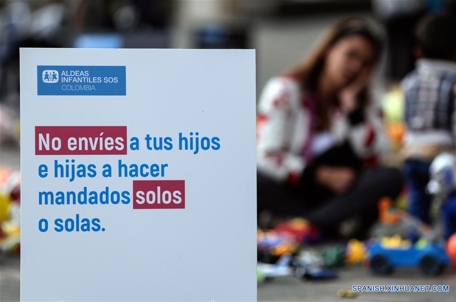 Un cartel es exhibido durante el "Plantón de Juguetes", en la Plaza Bolívar, en Bogotá, capital de Colombia, el 20 de noviembre de 2017. De acuerdo con información de la prensa local, con alrededor de 500 juguetes, la organización Aldeas Infantiles SOS Colombia llevó a cabo el lunes el "Plantón de Juguetes" en contra del abuso sexual infantil, y para crear conciencia sobre la necesidad del involucramiento de la ciudadanía en la proteción de los ni?os. (Xinhua/Jhon Paz)