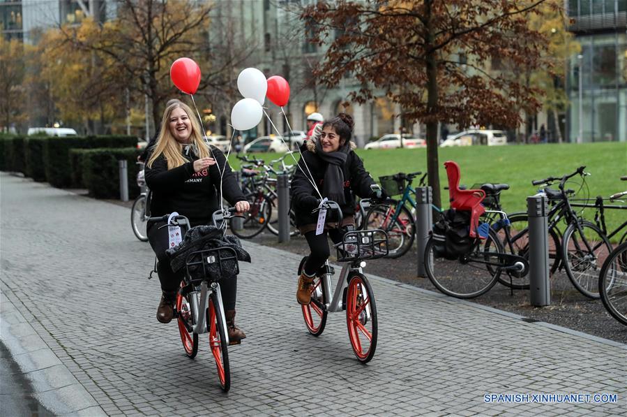 BERLIN, noviembre 21, 2017 (Xinhua) -- Empleadas montan bicicletas de la empresa china de bicicletas compartidas Mobike, en Berlín, capital de Alemania, el 21 de noviembre de 2017. La empresa china de bicicletas compartidas Mobike lanzó el martes su servicio con 700 bicicletas en Berlín, la primera ciudad en Alemania y la número 200 alrededor del mundo. (Xinhua/Shan Yuqi)
