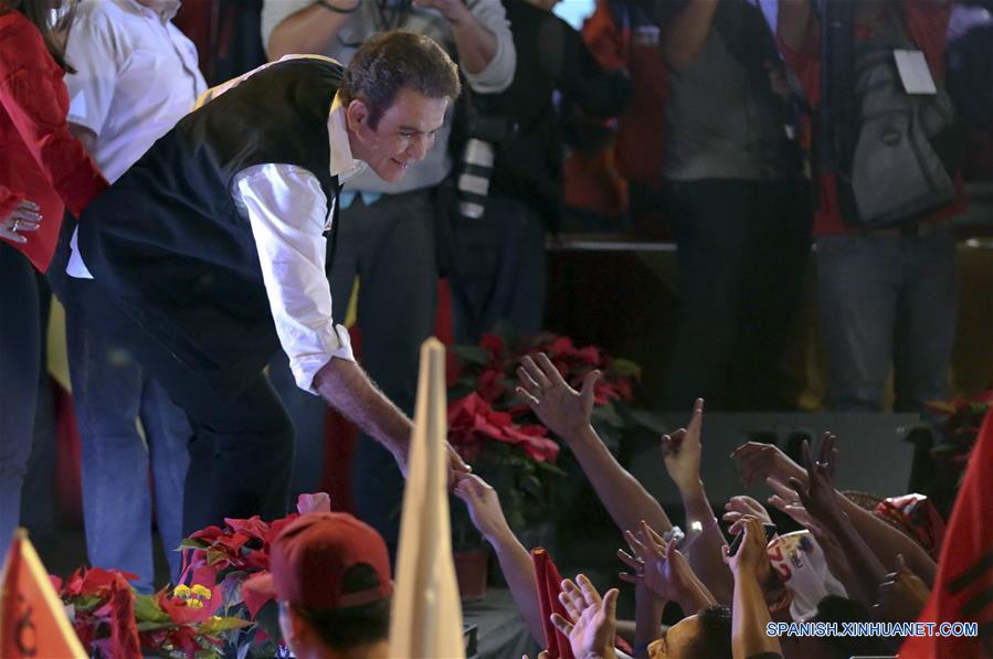 El candidato a la presidencia de Honduras por la Alianza de Oposición, Salvador Nasralla (i-frente), participa durante su acto de cierre de campa?a electoral, en Tegucigalpa, Honduras, el 20 de noviembre de 2017. Los candidatos presidenciales con mayor opción de triunfo en las elecciones generales del 26 de noviembre en Honduras, realizan el lunes masivos cierres de campa?a en la recta final de los comicios, con numerosas concentraciones en diversas ciudades del país. (Xinhua/Rafael Ochoa)