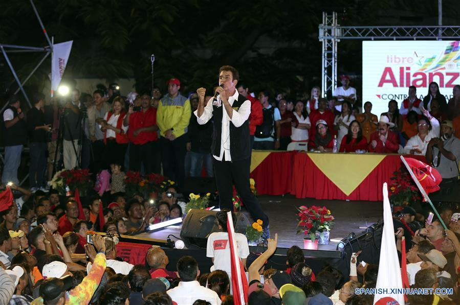 El candidato a la presidencia de Honduras por la Alianza de Oposición, Salvador Nasralla (c), participa durante su acto de cierre de campa?a electoral, en Tegucigalpa, Honduras, el 20 de noviembre de 2017. Los candidatos presidenciales con mayor opción de triunfo en las elecciones generales del 26 de noviembre en Honduras, realizan el lunes masivos cierres de campa?a en la recta final de los comicios, con numerosas concentraciones en diversas ciudades del país. (Xinhua/Rafael Ochoa)