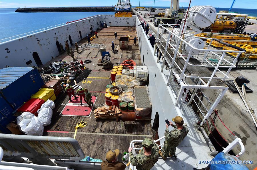 CHUBUT, noviembre 22, 2017 (Xinhua) -- Empleados realizan preparativos por parte de la Armada de Estados Unidos para colaborar con la búsqueda del submarino ARA San Juan, en el muelle marítimo de Comodoro Rivadavia, provincia de Chubut, Argentina, el 22 de noviembre de 2017. El portavoz de la Armada de la República Argentina (ARA) en Buenos Aires, Enrique Balbi, confirmó la ma?ana del miércoles que "no hay rastros" del submarino desaparecido el 15 de noviembre en el Atlántico sur con 44 tripulantes a bordo. El funcionario militar brindó un nuevo parte oficial en la sede de la ARA, en el barrio de Retiro en la zona norte de la capital argentina, donde descartó versiones que indicaban haber detectado "imágenes térmicas" en la zona de búsqueda. En tanto que, amigos y familiares de los 44 tripulantes del submarino argentino ARA San Juan, realizaron una misa en la Base Naval de la ciudad de Mar del Plata, para pedir por el regreso a casa de los marinos. La ceremonia religiosa, que tuvo lugar en la capilla "Stella Maris" de la Base Naval, fue organizada por amigos, familiares y compa?eros de la escuela del capitán de corbeta, Jorge Bergallo, uno de los 44 tripulantes del navío. (Xinhua/Maxi Jonas/TELAM)