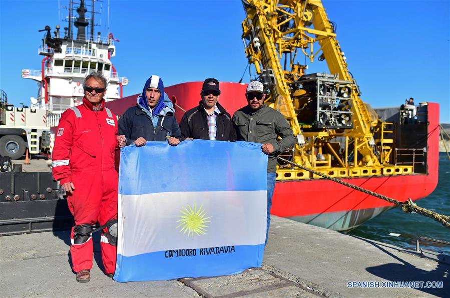 Miembros de la tripulación posan durante una ceremonia de despedida del buque "Sophie Siem" del puerto de Comodoro Rivadavia, en Argentina, el 26 de noviembre de 2017. El portavoz de la Armada de la República Argentina (ARA) en Buenos Aires, Enrique Balbi, afirmó el domingo que la fuerza mantiene una búsqueda "ininterrumpida" del submarino ARA San Juan, desaparecido el 15 de noviembre en el Atlántico sur con 44 tripulantes a bordo. El buque noruego "Sophie Siem" zarpó el domingo desde el puerto de la ciudad de Comodoro Rivadavia en el sur del país, navío que transporta un minisubmarino estadounidense para buscar al sumergible argentino perdido. (Xinhua/Maxi Jonas/TELAM)