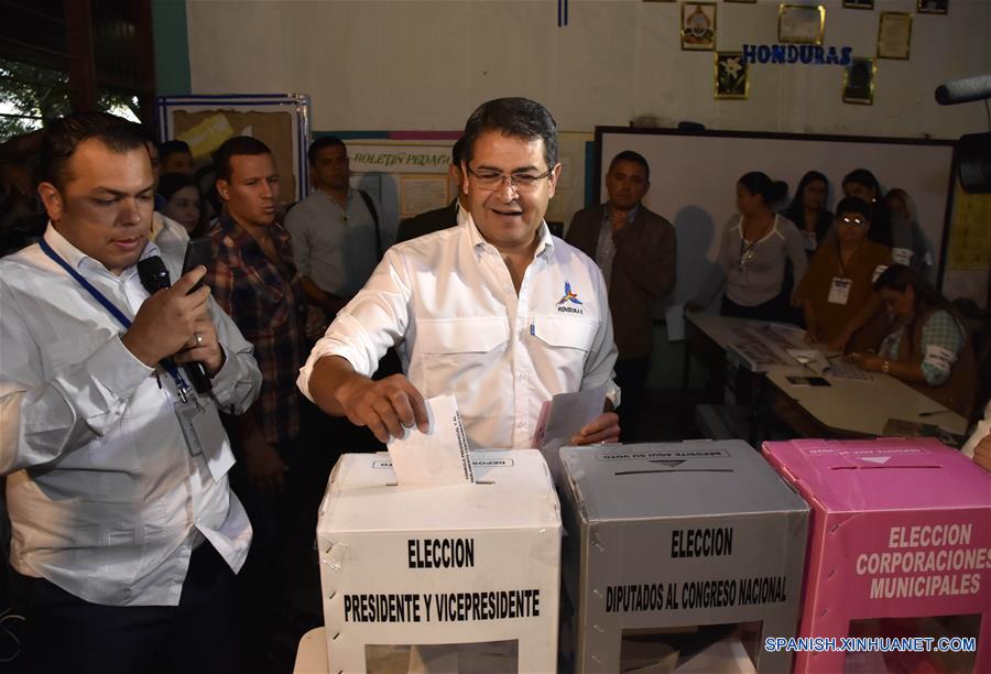 GRACIAS, noviembre 26, 2017 (Xinhua) -- El presidente de Honduras, Juan Orlando Hernández (2-i), emite su voto en la ciudad de Gracias, en el departamento de Lempira, Honduras, el 26 de noviembre de 2017. Las autoridades electorales de Honduras abrieron el domingo desde las 7 hora local (13:00 GMT) miles de urnas en el inicio de los comicios para elegir a su nuevo presidente, 298 alcaldías y 148 diputaciones. (Xinhua/Neftali Valenzuela)