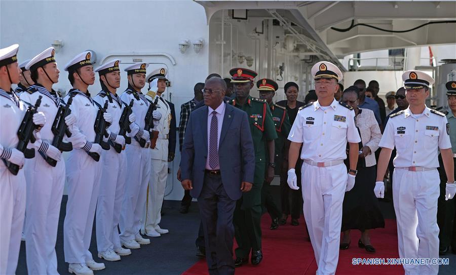 DAR ES SALAAM, noviembre 26, 2017 (Xinhua) -- El presidente de Tanzania, John Magufuli (3-d-frente), pasa revista a la guardia de honor a bordo del buque hospital de la Armada de China, Arca de la Paz, en Dar es Salaam, Tanzania, el 26 de noviembre de 2017. El presidente de Tanzania, John Magufuli, agradeció el domingo a los doctores chinos por tratar a más de 6,000 pacientes en el buque hospital de la Armada de China, Arca de la Paz, durante su estancia de ocho días en Dar es Salaam, Tanzania. (Xinhua/Jiang Shan)