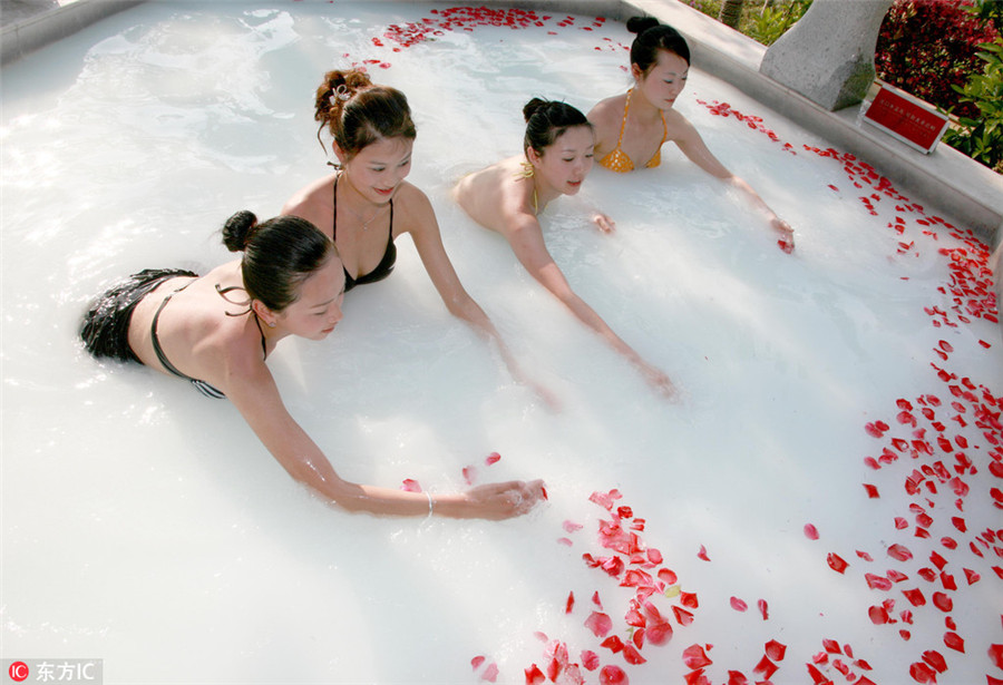 Varias mujeres se ba?an en un manantial con leche en Huangshan, provincia de Anhui, el 18 de noviembre de 2013. [Foto / IC]