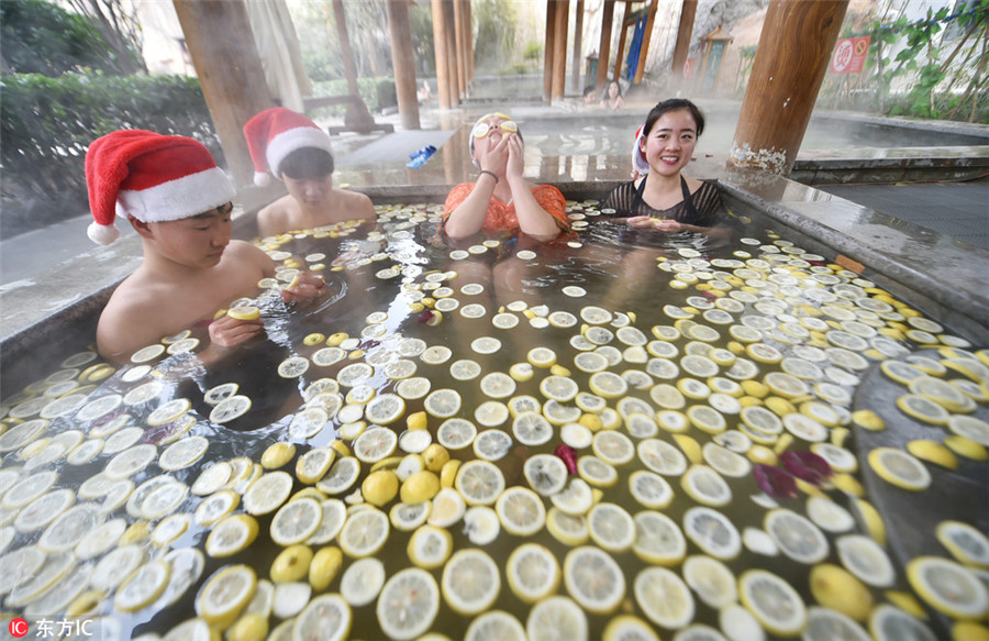 La gente descansa en los manantiales con trozos de limón en Luoyang, provincia de Henan, el 24 de diciembre de 2016. [Foto / IC]