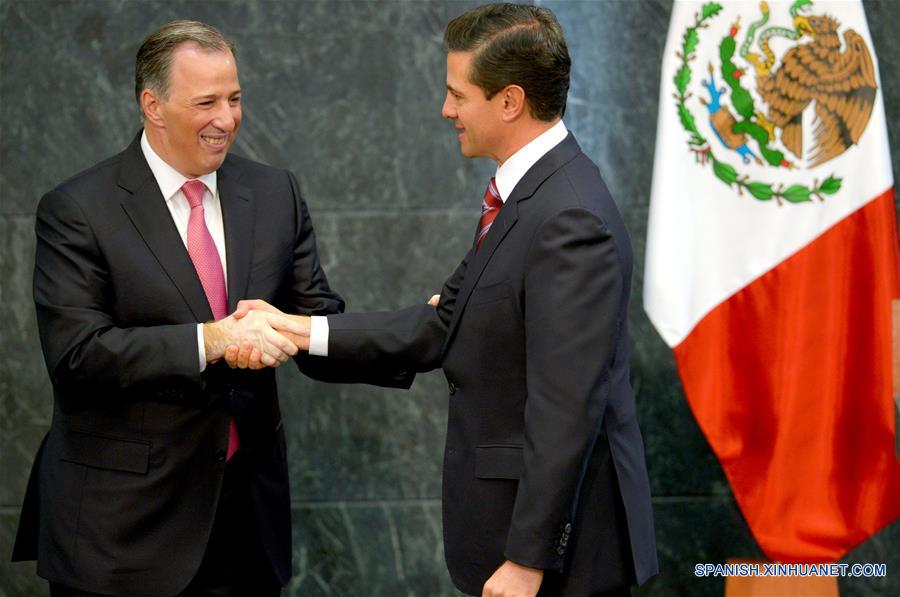 Imagen cedida por la Presidencia de México, del presidente mexicano Enrique Pe?a Nieto (d), estrechando la mano con el exsecretario mexicano de Hacienda, José Antonio Meade (i), mientras ofrece un mensaje a medios de comunicación en el que anunció cambios en su Gabinete, en la Ciudad de México, capital de México, el 27 de noviembre de 2017. El presidente de México, Enrique Pe?a Nieto, nombró el lunes a José Antonio González Anaya como nuevo secretario de Hacienda, tras la renuncia de José Antonio Meade. Tras renunciar como secretario de Hacienda de México, José Antonio Meade anunció el lunes su intención de buscar la candidatura presidencial por el partido oficialista para la elecciones de 2018. (Xinhua/Presidencia de México)
