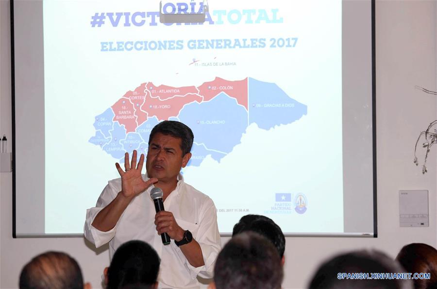 TEGUCIGALPA, noviembre 28, 2017 (Xinhua) -- Juan Orlando Hernández, actual presidente y candidato del Partido Nacional a la presidencia de Honduras, participa durante una conferencia de prensa en Tegucigalpa, Honduras, el 28 de noviembre de 2017. El presidente del Tribunal Supremo Electoral de Honduras, David Matamoros Batson, dijo el lunes que no puede ofrecer datos finales sobre la elección presidencial del domingo, pues aún hay dos millones de votos sin contar. En un primer corte, el Tribunal indicó que Salvador Nasralla, de la Alianza de Oposición, tuvo 45.7 por ciento de los votos, contra 40.21 de Juan Orlando Hernández, actual presidente y candidato del Partido Nacional, mientras que Luis Zelaya, del Partido Liberal, obtuvo 13.77 por ciento. (Xinhua/Neftali Valenzuela)