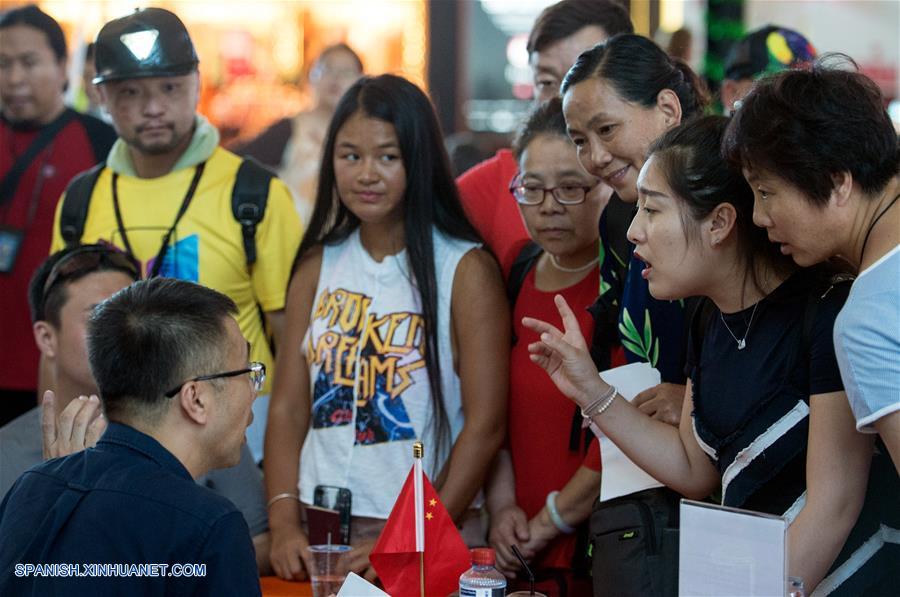 Turistas chinos dialogan con empleados del consulado de China en Denpasar de Indonesia, mientras esperan en el Aeropuerto Internacional Ngurah Rai, en Bali, Indonesia, el 30 de noviembre de 2017. El Ministerio de Transporte de Indonesia cerró el jueves otra vez el aeropuerto internacional en Lombok en la provincia de Nusa Tenggara Occidental debido al impacto de la ceniza volcánica del volcán Monte Agung en la cercana isla de Bali, informó un alto funcionario del gobierno. (Xinhua/Du Yu)