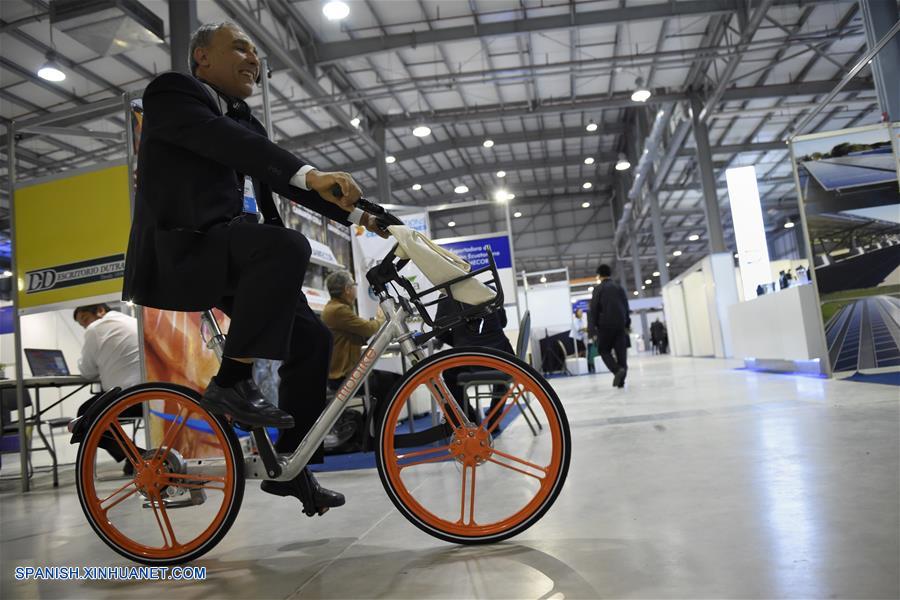 PUNTA DEL ESTE, diciembre 1, 2017 (Xinhua) -- Un representante de la compa?ía china de bicicletas compartidas Mobike, presenta una unidad a los representantes de los medios de comunicación durante la XI Cumbre Empresarial China-LAC (Latinoamérica y Caribe) 2017, en el Centro de Convenciones de Punta del Este, Uruguay, el 1 de diciembre de 2017. Mobike, una de las principales empresas de bicicletas de uso compartido de China, está presente en la XI Cumbre Empresarial China-LAC (Latinoamérica y Caribe) 2017. Mobike comenzó a funcionar en Shanghai en abril de 2016, antes de expandirse en las principales ciudades chinas e irrumpir en el exterior. En Punta del Este, decenas de los asistentes al evento se turnaron para conocer las bondades del producto, tomar fotos y, con una sonrisa, pasear en bicicleta por el lugar. (Xinhua/Nicolás Celaya)