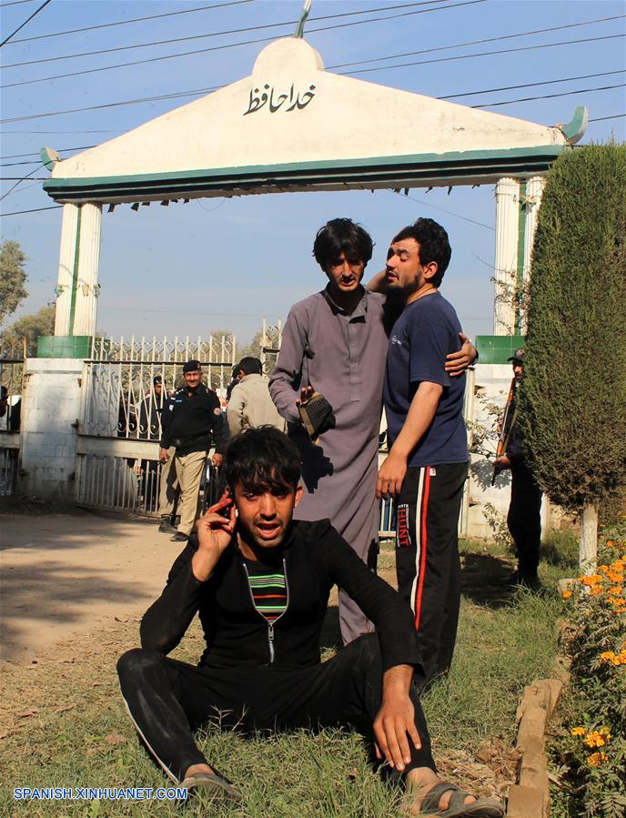Personas reaccionan frente a la Universidad de Agricultura de Peshawar luego de un ataque en Peshawar, Pakistán, el 1 de diciembre de 2017. (Xinhua/Umar Qayyum)