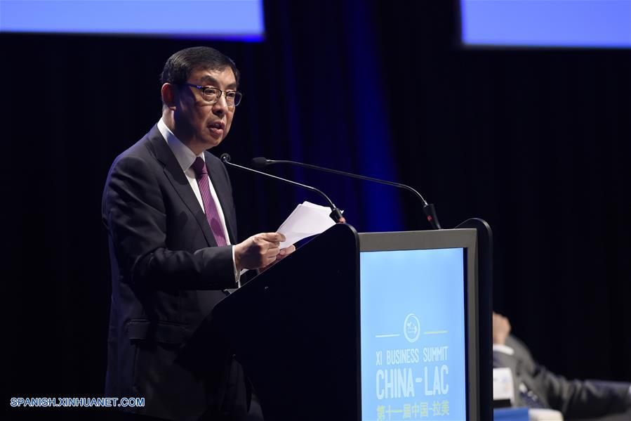 PUNTA DEL ESTE, diciembre 1, 2017 (Xinhua) -- El vicepresidente de la Conferencia Consultiva Política del Pueblo Chino, Ma Peihua, pronuncia su discurso durante la apertura de la XI Cumbre Empresarial China-LAC (Latinoamérica y Caribe) 2017, en el Centro de Convenciones de Punta del Este, Uruguay, el 1 de diciembre de 2017. El presidente de Uruguay, Tabaré Vázquez, afirmó el viernes en la apertura de la XI Cumbre Empresarial China-LAC (Latinoamérica y Caribe) 2017 en Punta del Este, que su país aspira a la firma en 2018 de un acuerdo de cooperación en varias áreas entre la CELAC y China. Vázquez se?aló que esta Cumbre que se desarrollará hasta el sábado en el balneario de Punta del Este, es una instancia preparatoria de la reunión ministerial de la Comunidad de Estados Latinoamericanos y Caribe?os (CELAC) y China de enero próximo en Santiago, Chile. En la apertura oficial de la XI Cumbre Empresarial China-LAC en el Centro de Convenciones de Punta del Este también participaron, además del presidente Vázquez, el vicepresidente de la Conferencia Consultiva Política del Pueblo Chino, Ma Peihua; y el vicepresidente del Consejo Chino para el Fomento del Comercio Internacional, Chen Zhou. (Xinhua/Nicolás Celaya)
