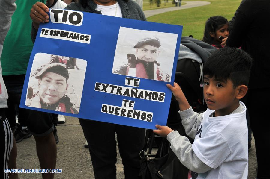 Familiares de un miembro de la tripulación del submarino ARA San Juan sostienen una pancarta durante una marcha para exigir la presencia del presidente argentino, Mauricio Macri, en la Base Naval de Mar del Plata, en la ciudad de Mar del Plata, Argentina, el 3 de diciembre de 2017. (Xinhua/Alejandro Moritz/TELAM)