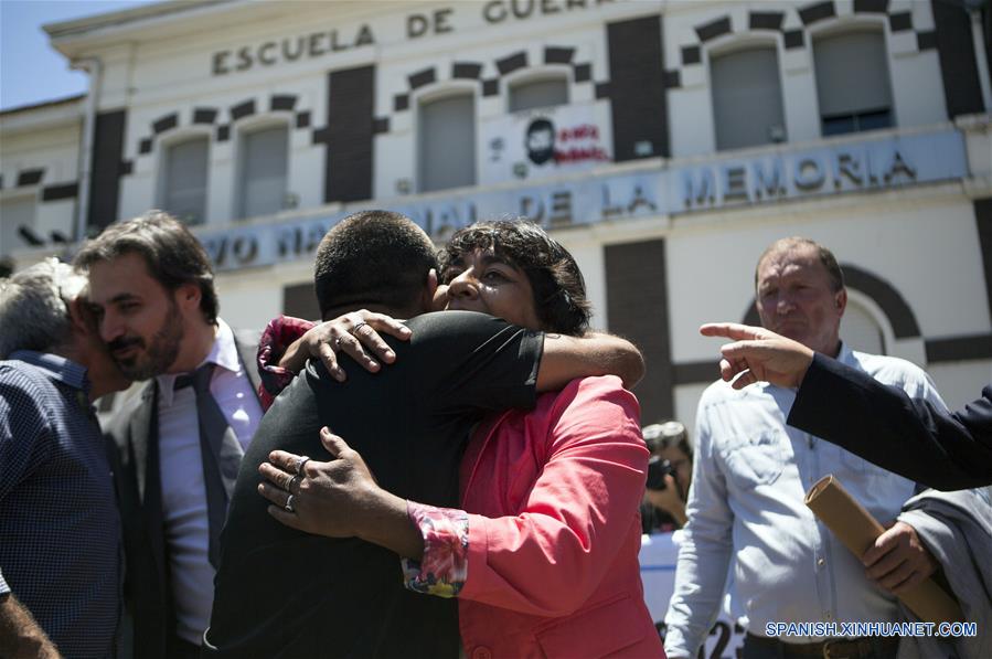 Norma Gómez (c-d), hermana del ex combatiente Eduardo Gómez, abraza a un ex combatiente al retirarse del Espacio Memoria y Derechos Humanos, en la ciudad de Buenos Aires, capital de Argentina, el 5 de diciembre de 2017. De acuerdo con información de la prensa local, fueron entregados a familiares objetos encontrados en los cuerpos de los 88 soldados argentinos caídos durante el conflicto bélico en las Islas Malvinas que fueron identificados en el cementerio de Darwin en el marco del Plan del Proyecto Humanitario que realizó el Comité Internacional de la Cruz Roja (CICR), desde el 20 de junio hasta el 7 de agosto de 2017, junto a un equipo de catorce especialistas forenses de Argentina, Australia, Chile, Espa?a, México y Reino Unido. La Secretaría de Derechos Humanos de la nación dio inicio al proceso de entrevistas para informarles acerca de los resultados de las tareas de identificación de los soldados argentinos sepultados en el Cementerio de Darwin, Islas Malvinas, tras el conflicto bélico de 1982 con Reino Unido en ese archipiélago del Atlántico sur. (Xinhua/Martín Zabala)