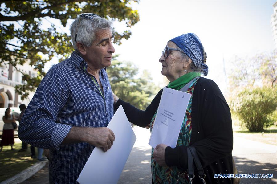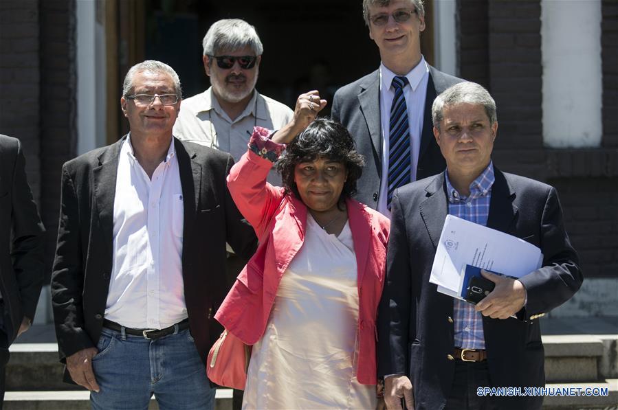 María Inés Romero (d), madre del ex combatiente Macedonio Rodriguez, reacciona junto al ex combatiente Hugo Robert (i), al retirarse del Espacio Memoria y Derechos Humanos, en la ciudad de Buenos Aires, capital de Argentina, el 5 de diciembre de 2017. De acuerdo con información de la prensa local, fueron entregados a familiares objetos encontrados en los cuerpos de los 88 soldados argentinos caídos durante el conflicto bélico en las Islas Malvinas que fueron identificados en el cementerio de Darwin en el marco del Plan del Proyecto Humanitario que realizó el Comité Internacional de la Cruz Roja (CICR), desde el 20 de junio hasta el 7 de agosto de 2017, junto a un equipo de catorce especialistas forenses de Argentina, Australia, Chile, Espa?a, México y Reino Unido. La Secretaría de Derechos Humanos de la nación dio inicio al proceso de entrevistas para informarles acerca de los resultados de las tareas de identificación de los soldados argentinos sepultados en el Cementerio de Darwin, Islas Malvinas, tras el conflicto bélico de 1982 con Reino Unido en ese archipiélago del Atlántico sur. (Xinhua/Martín Zabala)