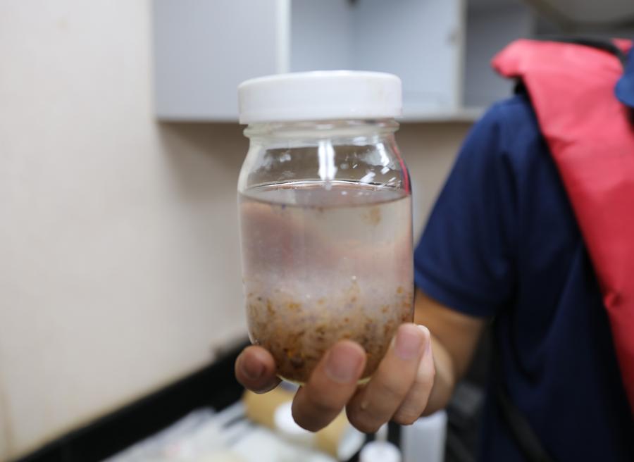 Un miembro del equipo de expedición ense?a la muestra de microplásticos recogidos del mar, el 19 de noviembre de 2017. [Foto / Xinhua]