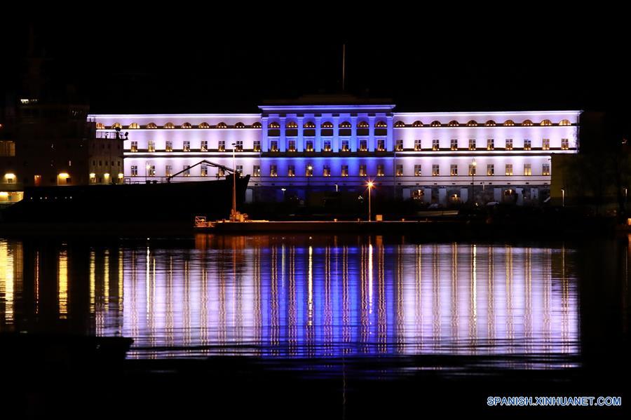 El edificio de oficinas del Ministerio de Relaciones Exteriores es iluminado con los colores de la bandera nacional finlandesa, en Helsinki, Finlandia, el 6 de diciembre de 2017. De acuerdo con información de la prensa local, 2017 marca el centenario de la independencia de Finlandia, y el martes y miércoles se llevaron a cabo las más importantes celebraciones. (Xinhua/Li Jizhi)