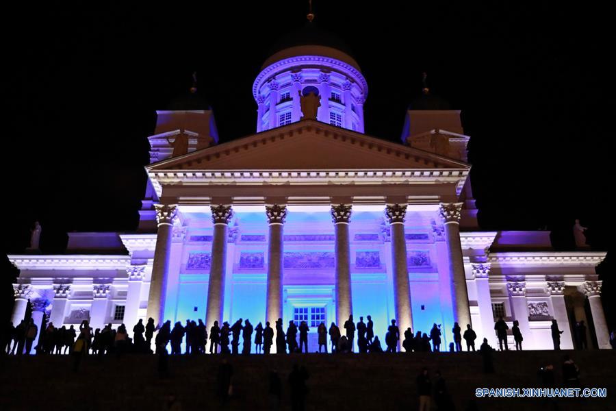 Una catedral es iluminada con los colores de la bandera nacional finlandesa, en Helsinki, Finlandia, el 6 de diciembre de 2017. De acuerdo con información de la prensa local, 2017 marca el centenario de la independencia de Finlandia, y el martes y miércoles se llevaron a cabo las más importantes celebraciones. (Xinhua/Li Jizhi)