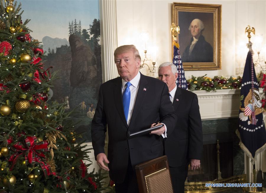 El presidente estadounidense, Donald Trump (frente), sostiene una declaración anunciando su intención de mover la embajada estadounidense en Israel a Jerusalén, en la Casa Blanca, en Washington D.C., Estados Unidos, el 6 de diciembre de 2017. El presidente de Estados Unidos, Donald Trump, anunció el miércoles su reconocimiento de Jerusalén como la capital de Israel y ordenó al Departamento de Estado iniciar el proceso del traslado de la embajada estadounidense de Tel Aviv a Jerusalén. (Xinhua/Chris Kleponis/CNP/ZUMAPRESS)