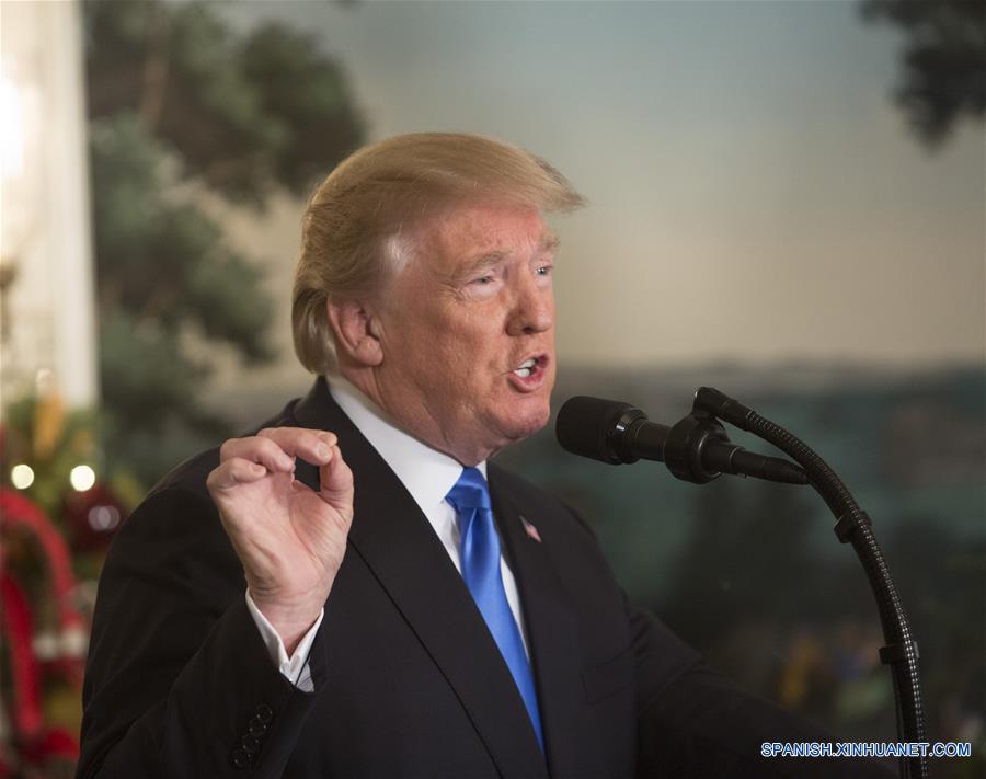 El presidente estadounidense, Donald Trump, pronuncia un discurso anunciando su intención de mover la embajada estadounidense en Israel a Jerusalén, en la Casa Blanca, en Washington D.C., Estados Unidos, el 6 de diciembre de 2017. El presidente de Estados Unidos, Donald Trump, anunció el miércoles su reconocimiento de Jerusalén como la capital de Israel y ordenó al Departamento de Estado iniciar el proceso del traslado de la embajada estadounidense de Tel Aviv a Jerusalén. (Xinhua/Chris Kleponis/CNP/ZUMAPRESS)