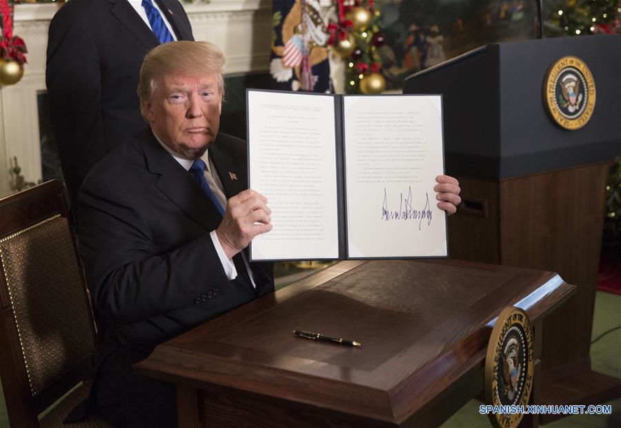 El presidente estadounidense, Donald Trump, muestra una declaración anunciando su intención de mover la embajada estadounidense en Israel a Jerusalén, en la Casa Blanca, en Washington D.C., Estados Unidos, el 6 de diciembre de 2017. El presidente de Estados Unidos, Donald Trump, anunció el miércoles su reconocimiento de Jerusalén como la capital de Israel y ordenó al Departamento de Estado iniciar el proceso del traslado de la embajada estadounidense de Tel Aviv a Jerusalén. (Xinhua/Chris Kleponis/CNP/ZUMAPRESS)
