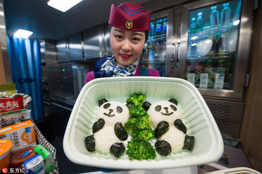 Chengdu, 08/12/2017 (El Pueblo en Línea) -Alimentos con la forma de un panda gigante se ofrecen a bordo del tren bala que hace el recorrido entre Xi'an, capital de la provincia de Shaanxi, y Chengdu, capital de la provincia china de Sichuan. La líneade alta velocidad Xi'an-Chengdu fue inaugurada este miércoles. Sus operaciones reducen el tiempo de viaje entre ambas importantes ciudades de China.6 de diciembre del 2017. [Foto: IC]