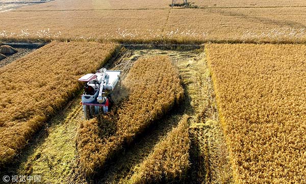 Cosecha de arroz conprocesos mecanizados en Dalian, provincia china de Liaoning, 24 de octubre del 2017. [Foto: VCG]