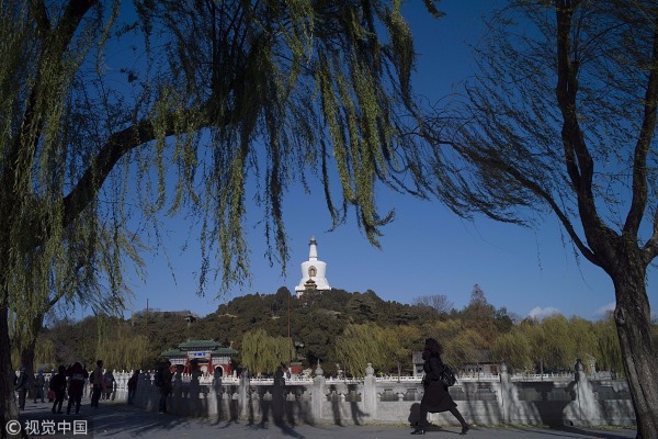 La gente pasea en el parque Beihai en un día despejado en Beijing. [Foto / VCG]