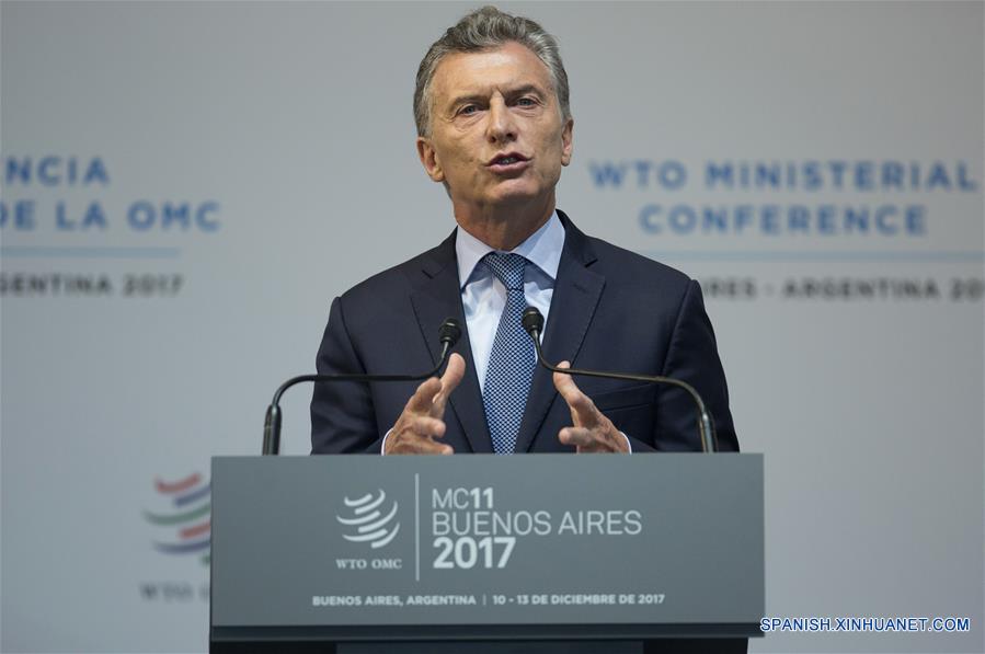BUENOS AIRES, diciembre 10, 2017 (Xinhua) -- El presidente de Argentina, Mauricio Macri, preside la ceremonia inaugural de la XI Conferencia Ministerial (11CM) de la Organización Mundial de Comercio (OMC), en el Centro de Exposiciones y Convenciones de la ciudad de Buenos Aires, Argentina, el 10 de diciembre de 2017. La XI Conferencia Ministerial (11CM) de la Organización Mundial del Comercio (OMC) quedó inaugurada oficialmente el domingo en Buenos Aires, tras discursos de apertura formulados por el presidente de Argentina, Mauricio Macri, y el director general del organismo, el brasile?o Roberto Azevedo. (Xinhua/Martín Zabala)