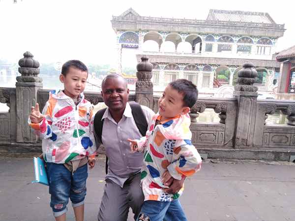 Kimeng Hilton Ndukong, periodista de Camerún, posa con dos gemelos chinos durante una visita al Palacio de Verano de Beijing. Foto de Getachew Yalew