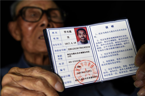 Guan muestra el documento que lo identifica. El testimonio de Guan fue recogido en un libro que se publicó en el 2016. [Foto: Xinhua]
