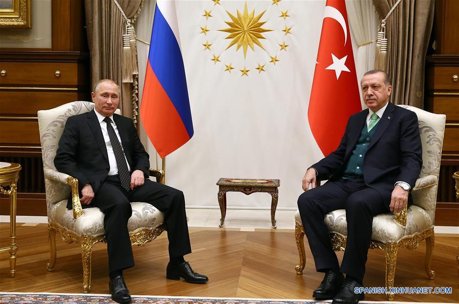 Imagen cedida por el Palacio Presidencial de Turquía, del presidente turco, Recep Tayyip Erdogan (d), participando en una reunión con su homólogo de Rusia, Vladimir Putin, durante su reunión en Ankara, Turquía, el 11 de diciembre de 2017. De acuerdo con información de la prensa local, Erdogan y Putin advirtieron el lunes que el movimiento de Estados Unidos en Jerusalén desestabiliza a Medio Oriente y no ayudará a resolver el conflicto israelí-palestino. (Xinhua/Palacio Presidencial de Turquía)
