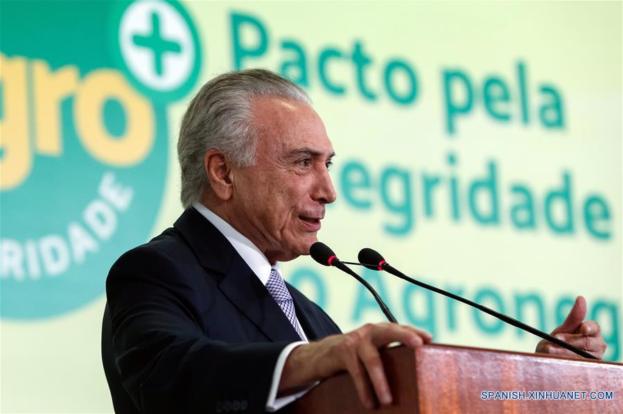 Imagen cedida por la Presidencia de Brasil, del presidente brasile?o, Michel Temer, pronunciando un discurso durante un acto de la Confederación Nacional de Agricultura (CNA), en el Palacio de Planalto en Brasilia, Brasil, el 12 de diciembre de 2017. El presidente de Brasil, Michel Temer, afirmó el martes que el país vive un "momento reformista", citando la reforma de la Seguridad Social y la necesidad de aprobarla cuanto antes. La declaración fue realizada en un acto en la Confederación Nacional de Agricultura (CNA), la entidad que reúne a los grandes productores rurales del país. (Xinhua/Alan Santos/Presidencia de Brasil)