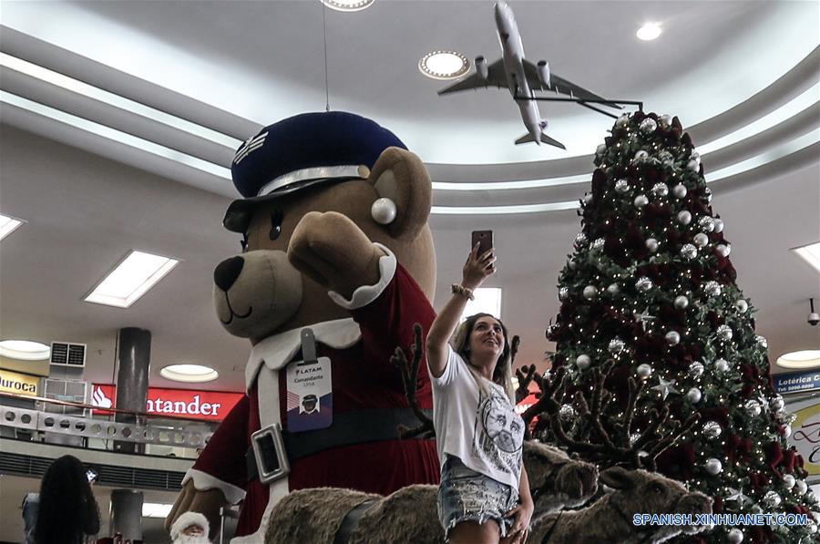 Una mujer se toma fotografías con los adornos de Navidad, en el Aeropuerto de Congonhas en Sao Paulo, Brasil, el 13 de diciembre de 2017. (Xinhua/Rahel Patrasso)