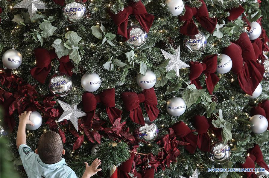 SAO PAULO, diciembre 13, 2017 (Xinhua) -- Un ni?o toca una esfera de un árbol de Navidad, en el Aeropuerto de Congonhas en Sao Paulo, Brasil, el 13 de diciembre de 2017. (Xinhua/Rahel Patrasso)