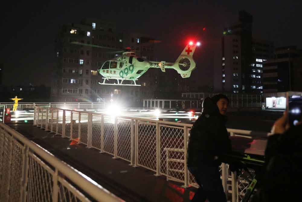 El helicóptero-ambulancia está listo para aterrizar en el Hospital de la Amistad Chino-Japonés. [Foto: Zhu Xingxin]