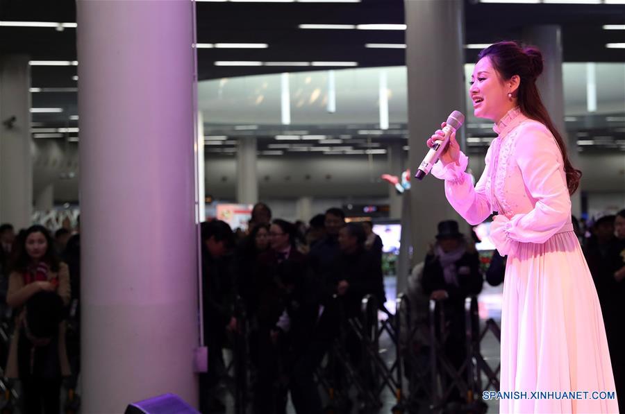 La cantante Xi Yanjuan interpreta una melodía durante un espectáculo de caridad llevado a cabo en la Estación de Metro Plaza del Pueblo, en Shanghai, en el este de China, el 16 de diciembre de 2017. Este es el espectáculo de caridad número 500 que se lleva a cabo cada fin de semana en las zonas de música del metro en Shanghai. (Xinhua/Fang Zhe)