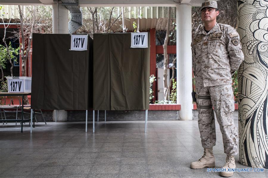 Un funcionario de la Fuerza Aérea de Chile (FACH), encargado de la seguridad y el orden, custodia la sala donde se encuentran las urnas en un centro de votación la víspera de las elecciones presidenciales, en la comuna de Santiago, Chile, el 16 de diciembre de 2017. (Xinhua/Jorge Villegas)