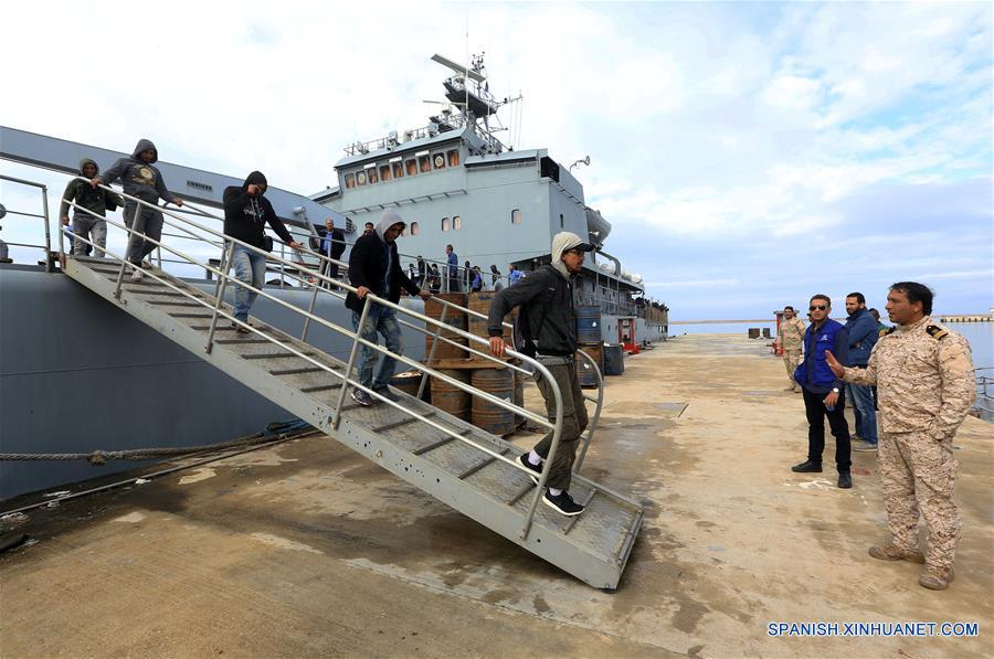 Inmigrantes ilegales llegan a una base naval en Trípoli, Libia, el 16 de diciembre de 2017. Los inmigrantes llegaron a la base naval después de ser rescatados de la costa de Garabulli, a 60 km al este de la capital Libia. (Xinhua/Hamza Turkia)