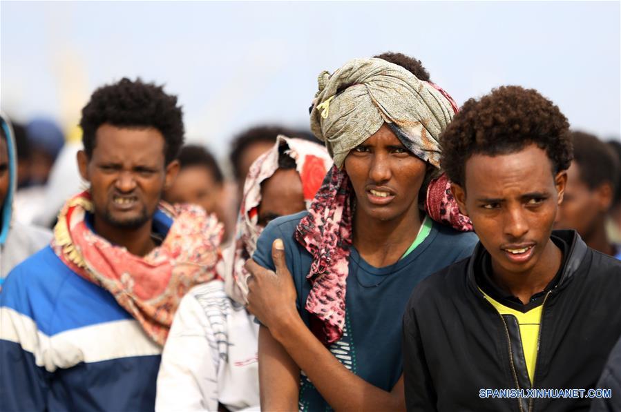 Inmigrantes ilegales llegan a una base naval en Trípoli, Libia, el 16 de diciembre de 2017. Los inmigrantes llegaron a la base naval después de ser rescatados de la costa de Garabulli, a 60 km al este de la capital Libia. (Xinhua/Hamza Turkia)