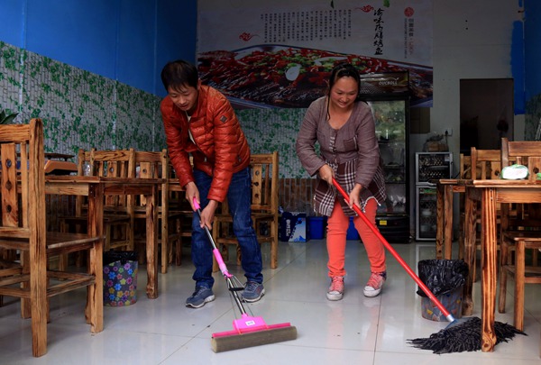 Zhu Aiyong y su esposa limpian su restaurante de pescado asado, que la pareja abriódespués de reubicarse. (Foto: Yang Jun)