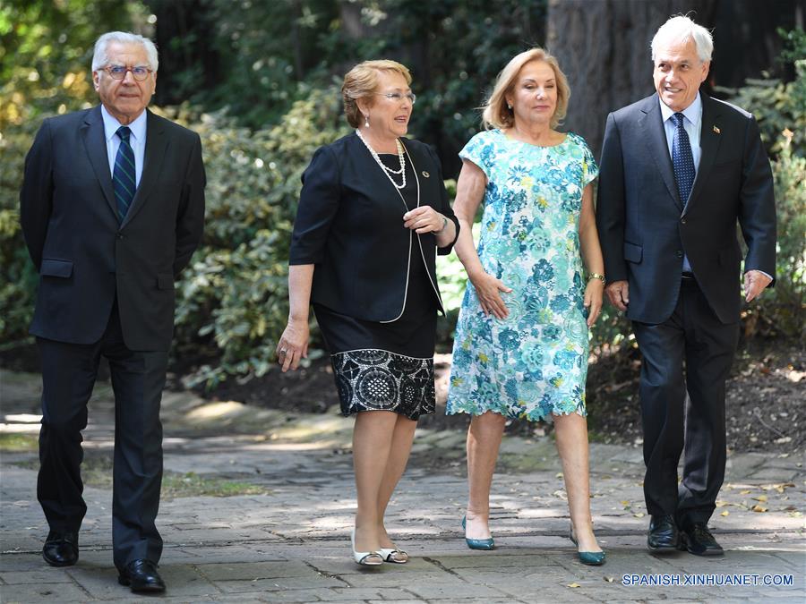 La presidenta de Chile, Michelle Bachelet (2-i), conversa con el presidente electo, Sebastián Pi?era (d), luego de un desayuno en Santiago, capital de Chile, el 18 de diciembre de 2017. Sebastián Pi?era, quien se proclamó ganador de la segunda vuelta de las elecciones presidenciales celebradas el domingo en Chile, afirmó el lunes que en su segundo mandato buscará conformar un equipo plural, tras imponerse con holgura en segunda vuelta ante el oficialismo de centro-izquierda. (Xinhua/Jorge Villegas)