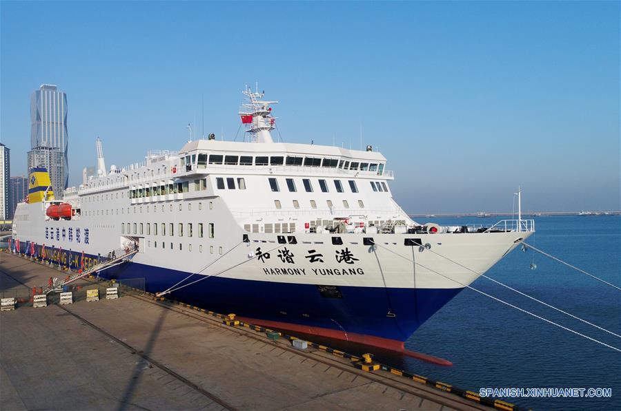 Imagen del 18 de diciembre de 2017 del buque de pasajeros llamado "Harmony Yungang" permaneciendo anclado en el Puerto de Lianyungang en la ciudad de Lianyungang, provincia de Jiangsu, en el este de China. El gran buque de pasajeros, que mide 196 metros de largo y 28.6 metros de ancho, puede alojar a 1,080 pasajeros durante su viaje de Lianyungang a la ciudad sudcoreana de Incheon. (Xinhua/Wang Jianmin)