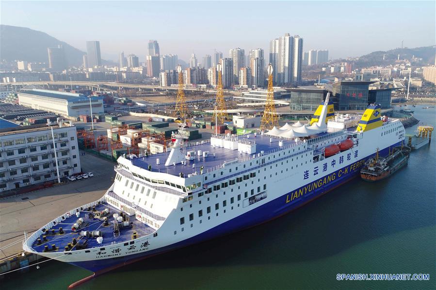 JIANGSU, diciembre 19, 2017 (Xinhua) -- Imagen del 18 de diciembre de 2017 del buque de pasajeros llamado "Harmony Yungang" permaneciendo anclado en el Puerto de Lianyungang en la ciudad de Lianyungang, provincia de Jiangsu, en el este de China. El gran buque de pasajeros, que mide 196 metros de largo y 28.6 metros de ancho, puede alojar a 1,080 pasajeros durante su viaje de Lianyungang a la ciudad sudcoreana de Incheon. (Xinhua/Wang Jianmin)