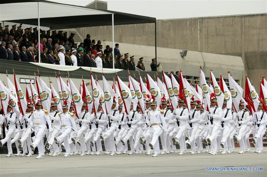 Integrantes de la Marina de Guerra de Perú participan en el desfile llevado a cabo durante la ceremonia de reconocimiento del nuevo comandante general del Ejército del Perú, César Augusto Astudillo Salcedo, encabezada por el ministro de Defensa de Perú, Jorge Nieto Montesinos, en la Plaza Cáceres del Cuartel General del Ejército del distrito de San Borja, Lima, Perú, el 19 de diciembre de 2017. El general César Augusto Astudillo Salcedo fue nombrado el martes comandante general del Ejército en reemplazo del general de división Luis Humberto Ramos Hume, de acuerdo con información de la prensa local. (Xinhua/Luis Camacho)
