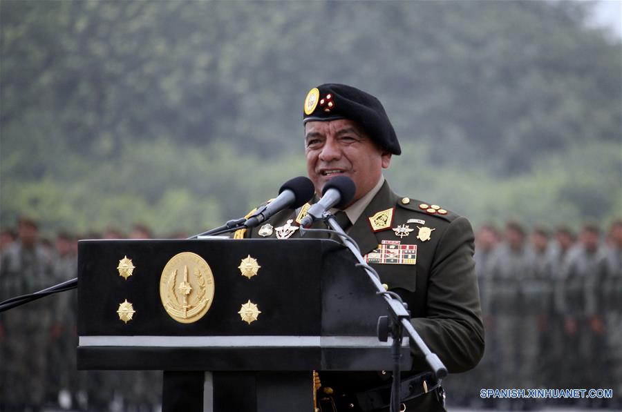 El nuevo comandante general del Ejército de Perú, César Augusto Astudillo Salcedo, pronuncia un discurso durante la ceremonia de reconocimiento de su cargo encabezada por el ministro de Defensa de Perú, Jorge Nieto Montesinos, en la Plaza Cáceres del Cuartel General del Ejército del distrito de San Borja, Lima, Perú, el 19 de diciembre de 2017. El general César Augusto Astudillo Salcedo fue nombrado el martes comandante general del Ejército en reemplazo del general de división Luis Humberto Ramos Hume, de acuerdo con información de la prensa local. (Xinhua/Luis Camacho)