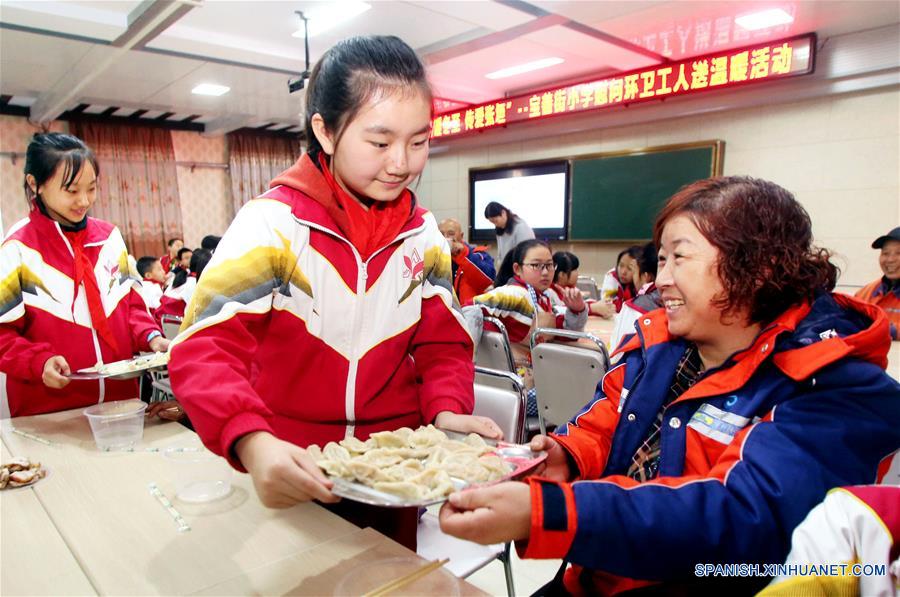 HEBEI, diciembre 21, 2017 (Xinhua) -- Estudiantes de una escuela primaria elaboran bolas de masa hervida para trabajadores de saneamiento para recibir al próximo festival del Solsticio de invierno, en Zhangjiakou, provincia de Hebei, en el norte de China, el 21 de diciembre de 2017. El Solsticio de invierno, el día más corto del a?o, cae el 22 de diciembre este a?o. En la cultura china el Solsticio de invierno marca el comienzo del invierno profundo y un descando para las actividades agrícolas en la sociedad agrícola tradicional. Es también un tiempo para las reuniones familiares. (Xinhua/Wang Xiao)