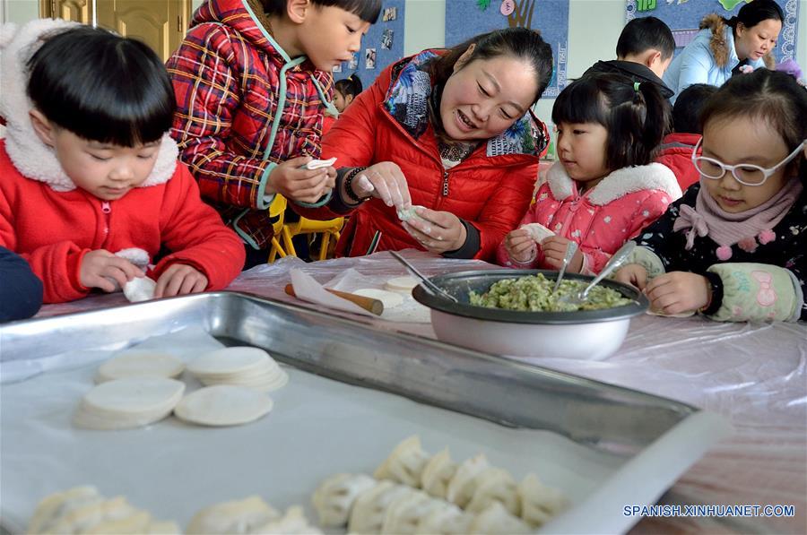 HUBEI, diciembre 21, 2017 (Xinhua) -- Estudiantes y su maestra elaboran bolas de masa hervida juntos para celebrar el próximo festival del Solsticio de invierno en un jardín de ni?os en el condado de Baokang en la ciudad de Xiangyang, provincia de Hubei, en el centro de China, el 21 de diciembre de 2017. El Solsticio de invierno, el día más corto del a?o, cae el 22 de diciembre este a?o. En la cultura china el Solsticio de invierno marca el comienzo del invierno profundo y un descanso para las actividades agrícolas en la sociedad agrícola tradicional. Es también un tiempo para las reuniones familiares. (Xinhua/Yang Tao)